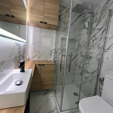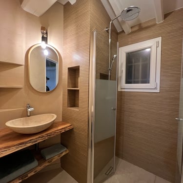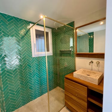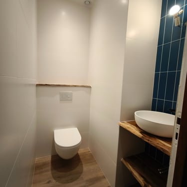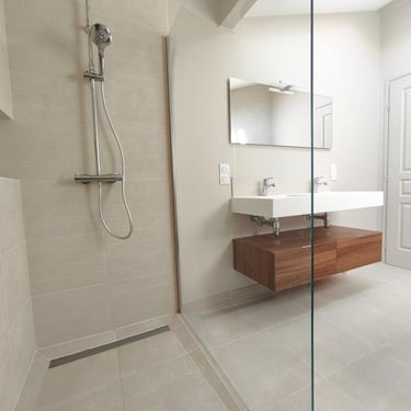 Création et rénovation sur mesure pour une salle de bains fonctionnelle et esthétique.